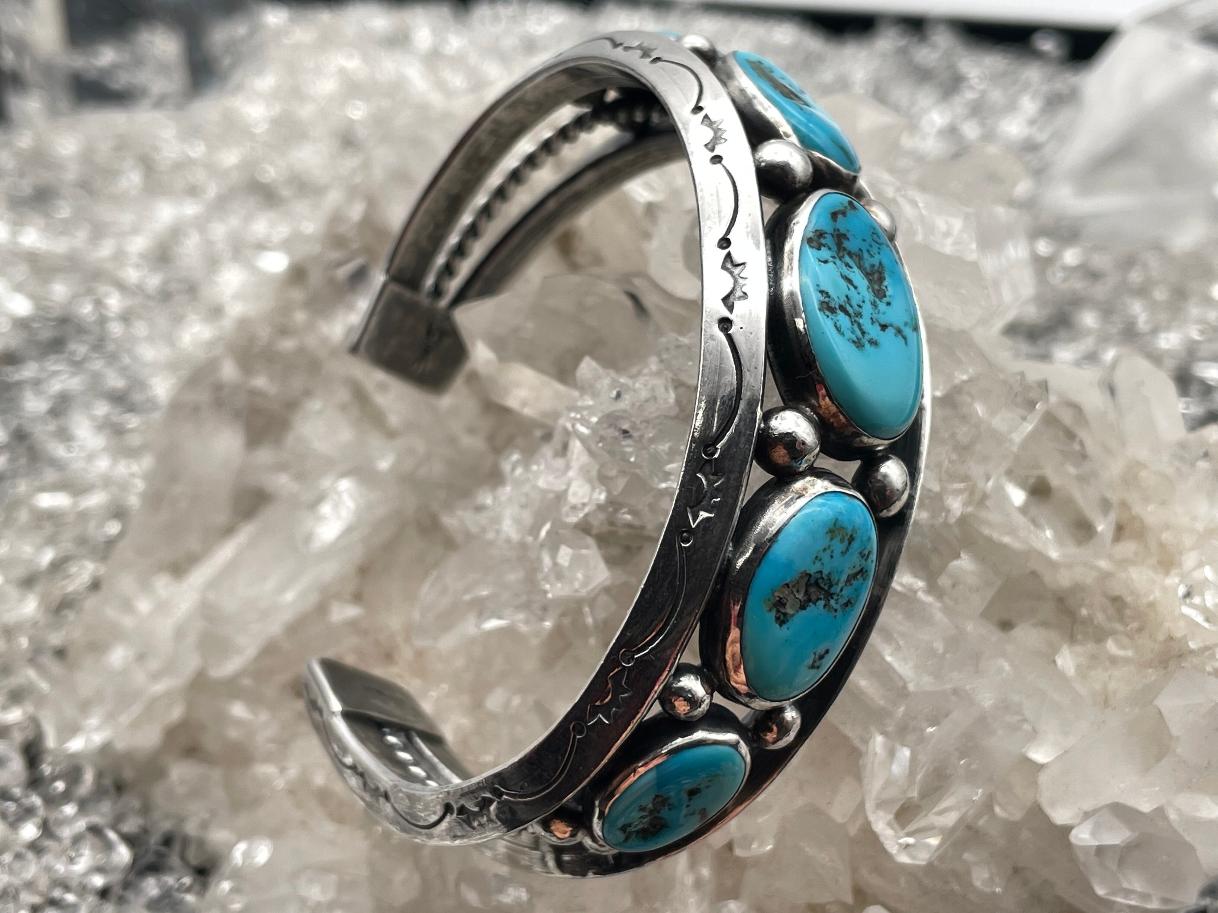 ターコイズが複数埋め込まれたシルバーバングルになります。