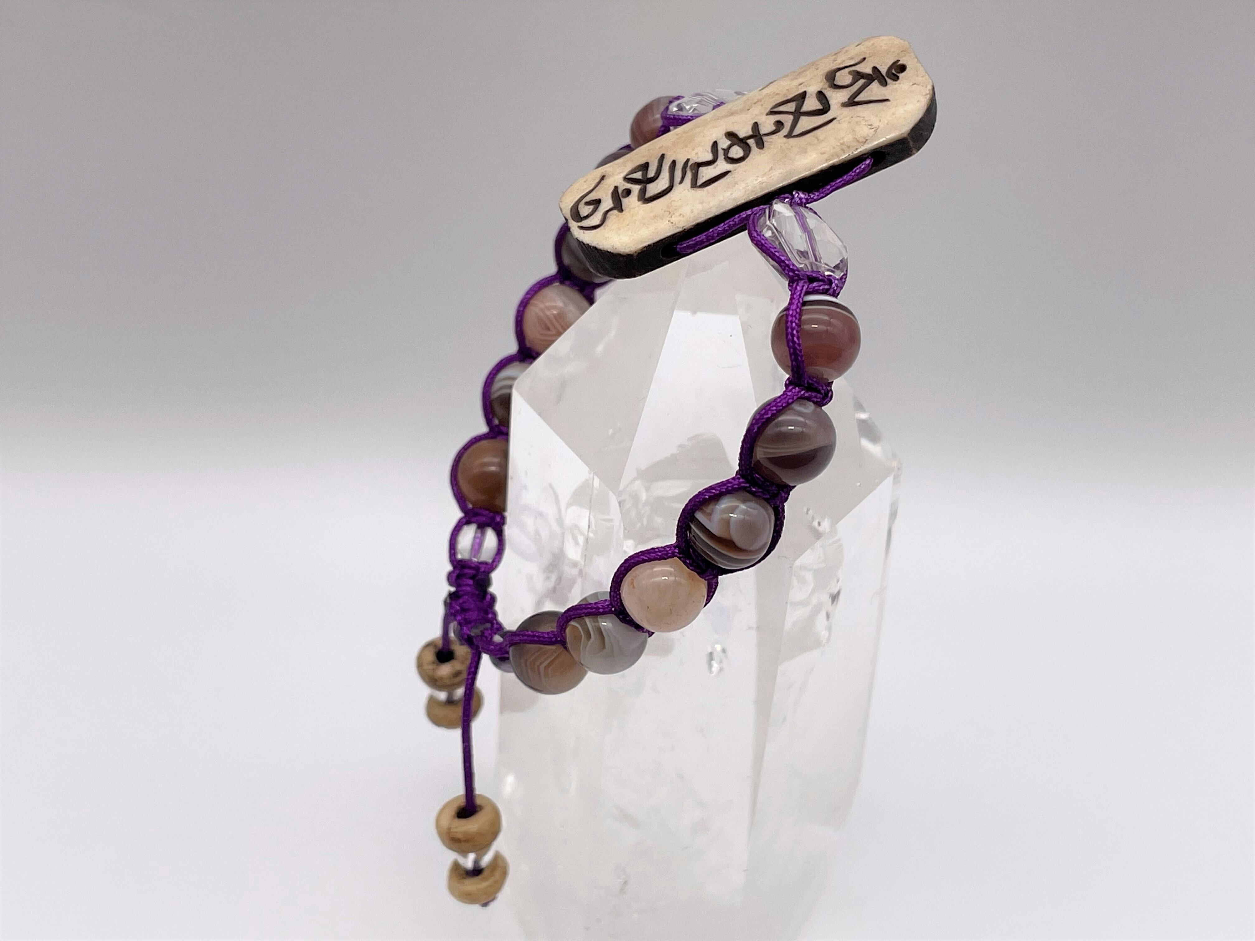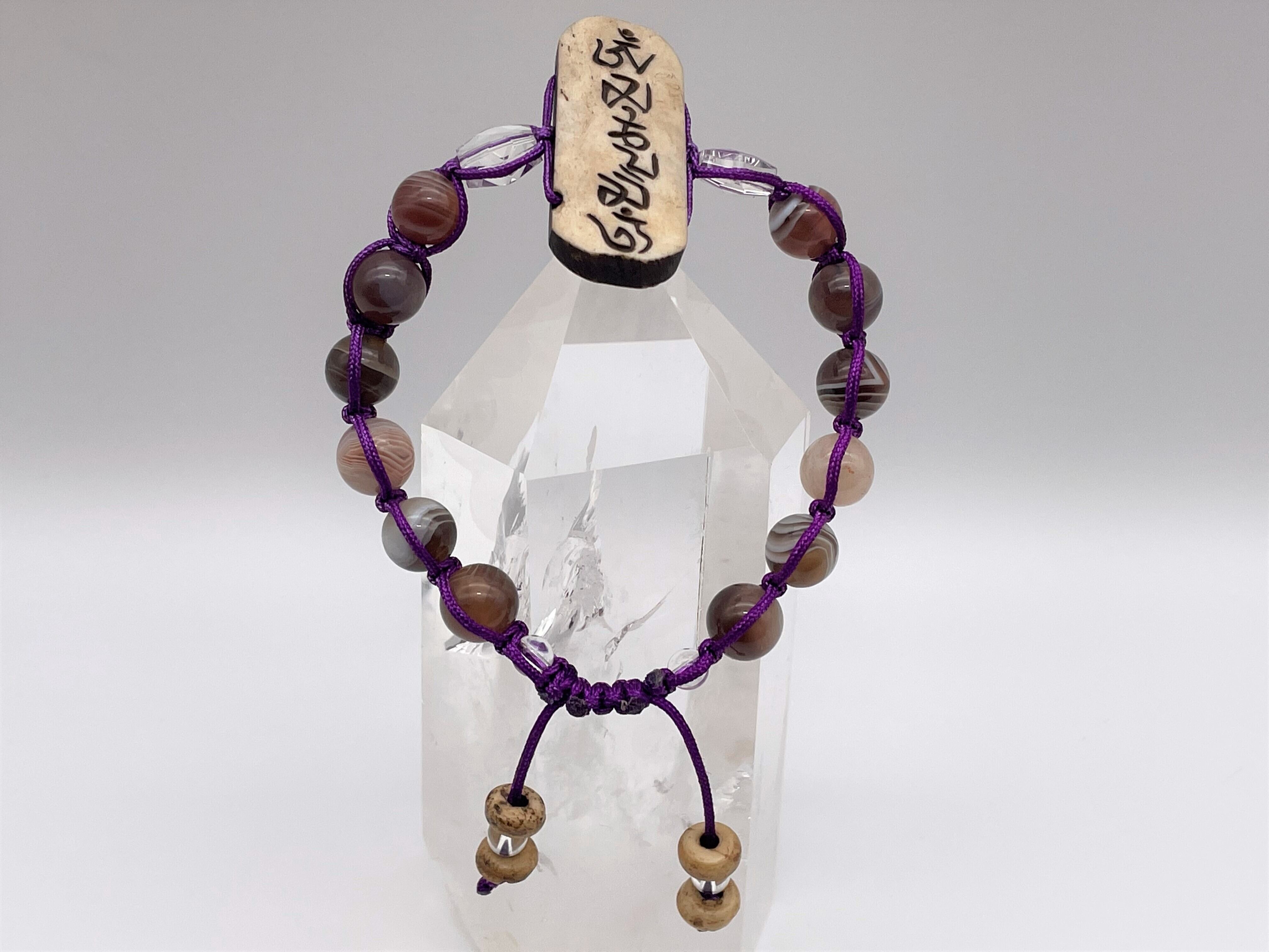 オンマニが彫られたボーンを中心に、六芒星(ヒランヤ)に加工された本水晶・ボツワナ瑪瑙・左巻きのスパイラル水晶をバランス良く組み合わせ、とても美しいブレスレットに仕上げました。