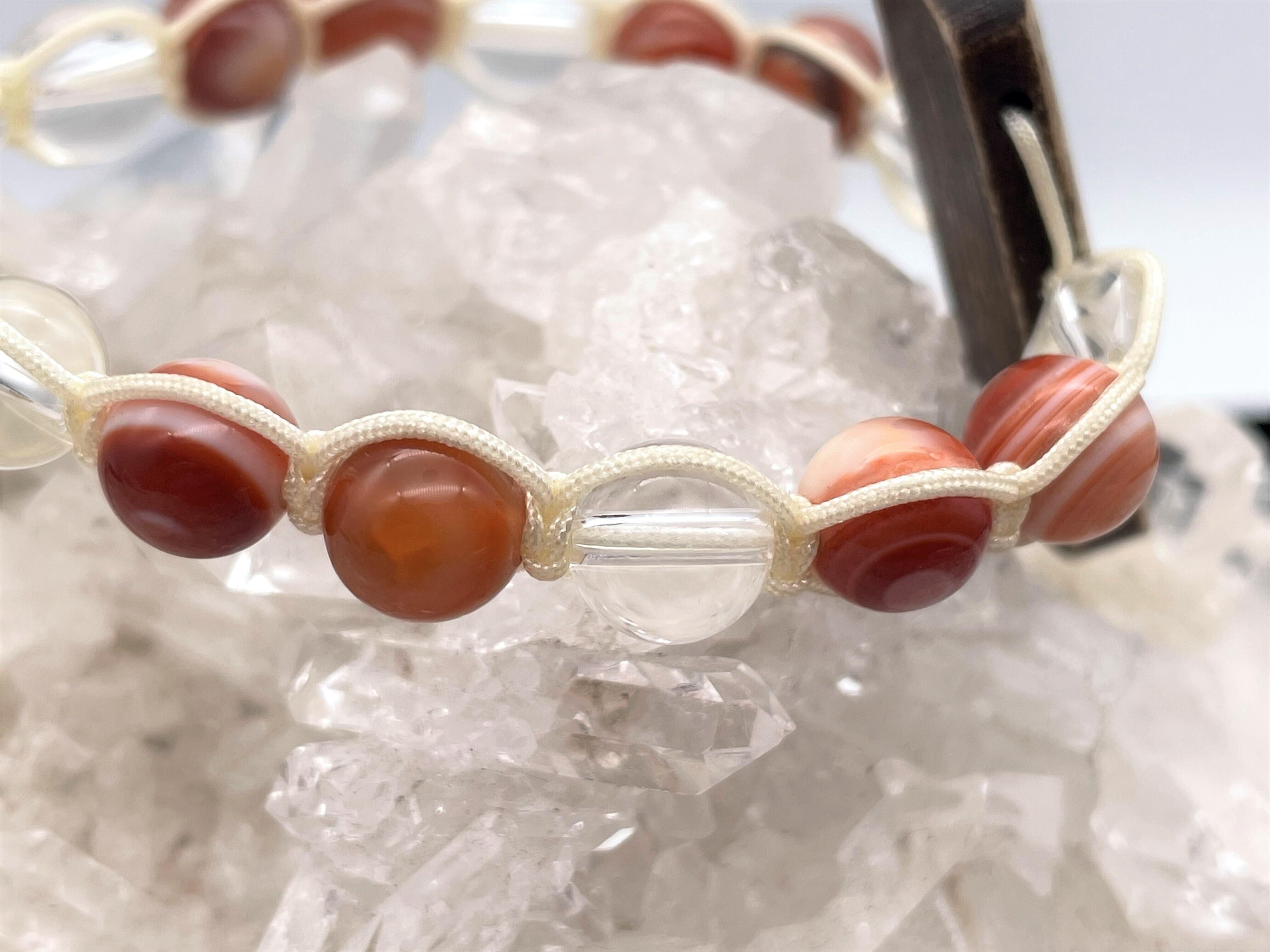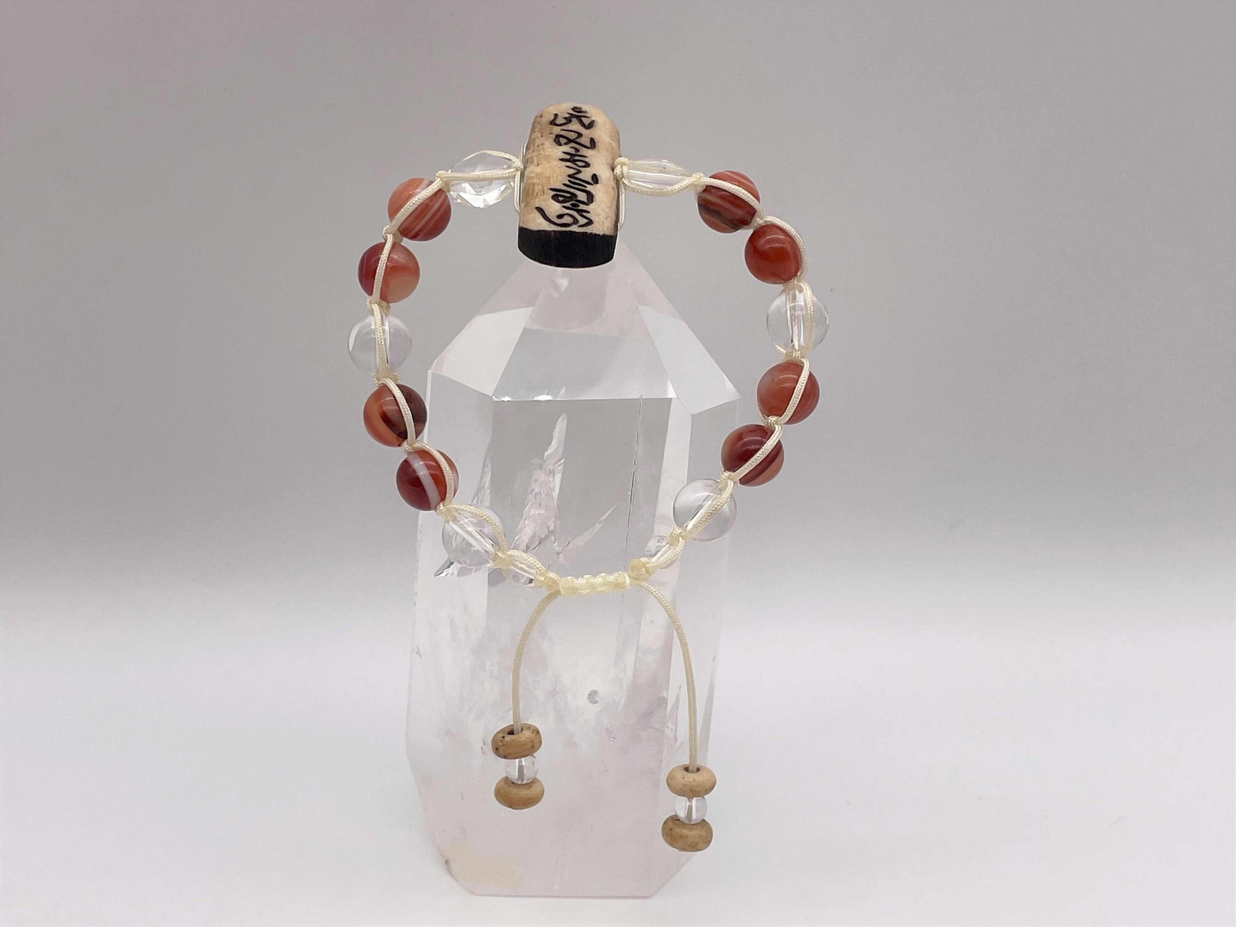 オンマニが彫られたボーンを中心に、六芒星(ヒランヤ)に加工された本水晶・赤天眼石・本水晶(8mm,6mm)玉をバランス良く組み合わせ、白と赤を中心としたとても美しいブレスレットに仕上げました。