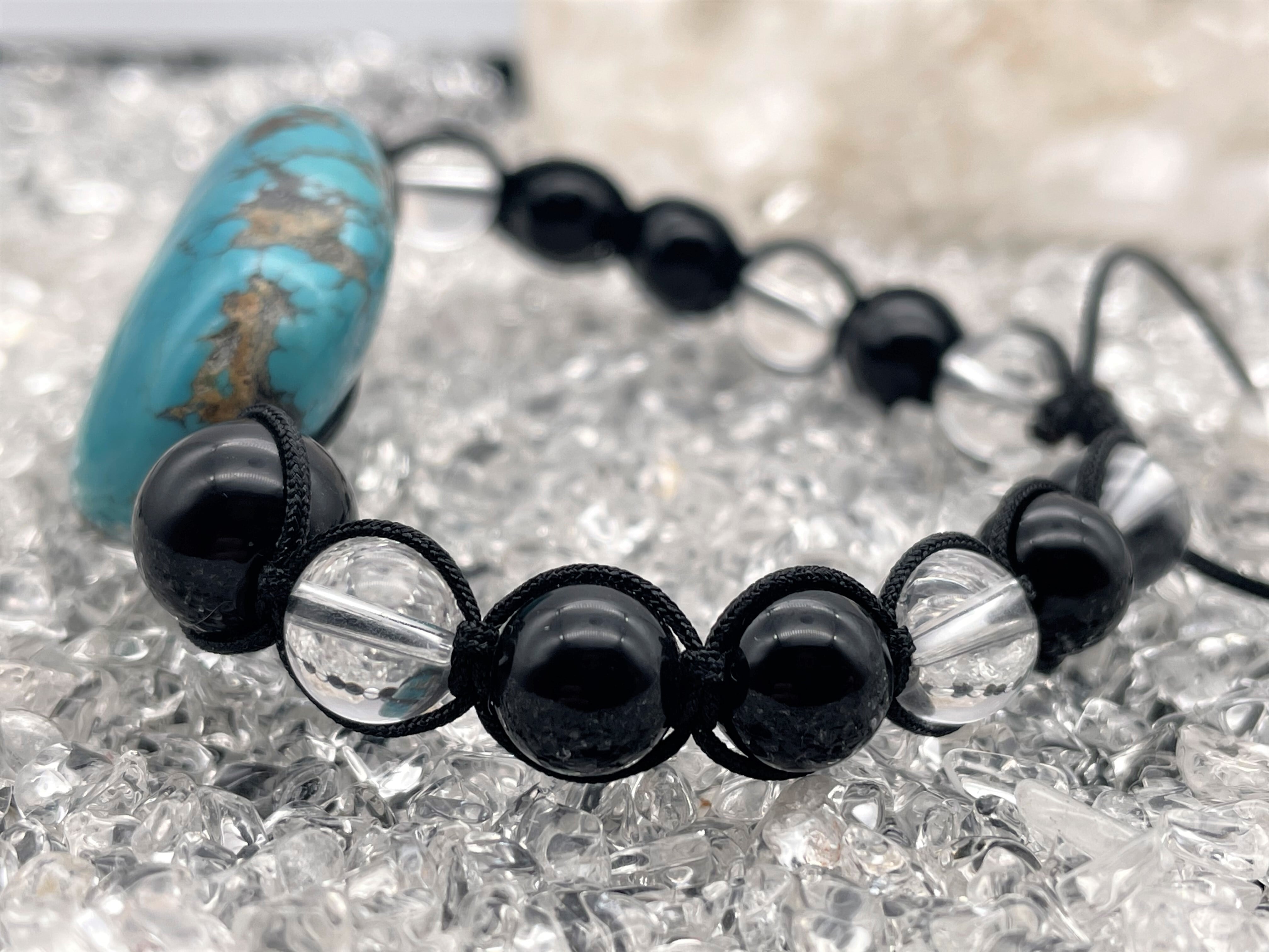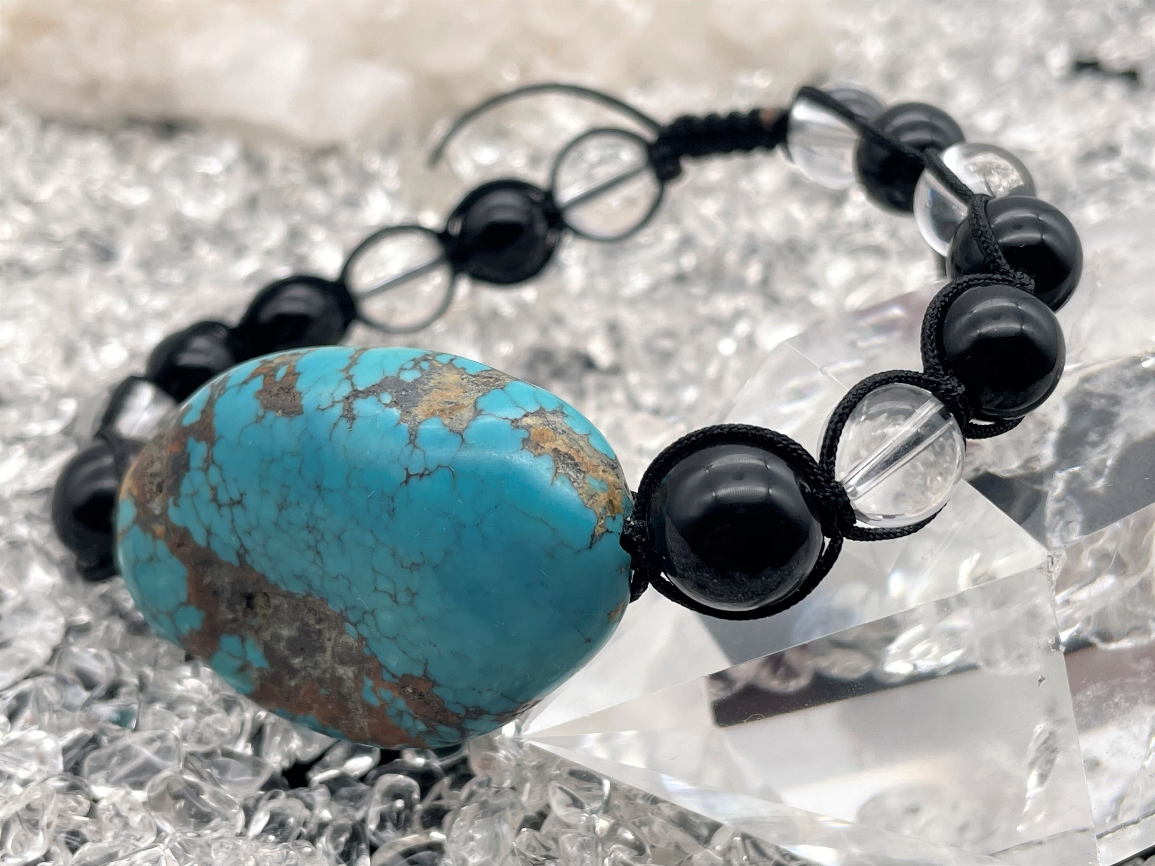 トルコ石を中心に、天然オニキス・本水晶ををバランス良く組み合わせ、ストラップに6mmのルチルクォーツをアクセントにすることで、とても美しいブレスレットに仕上げました。