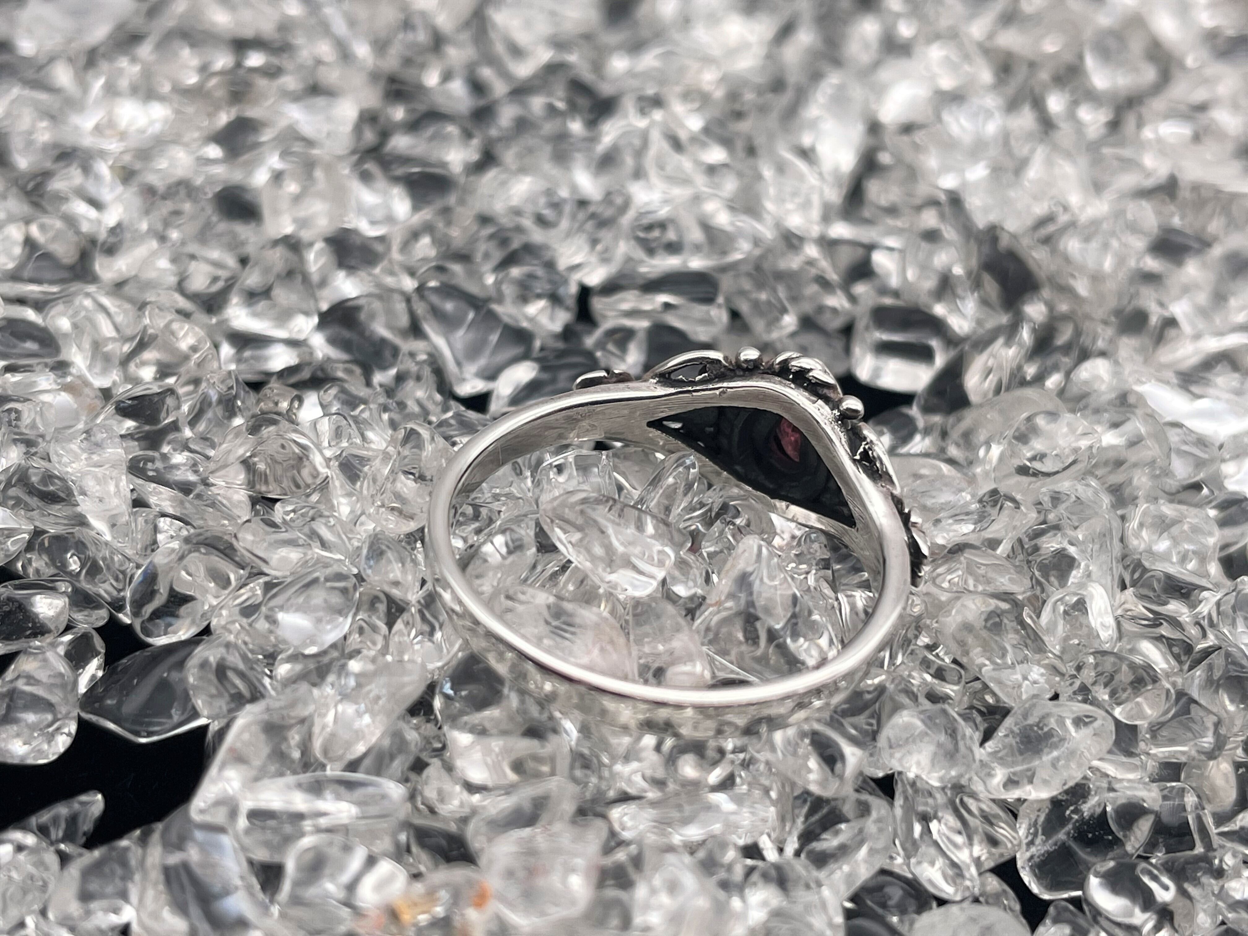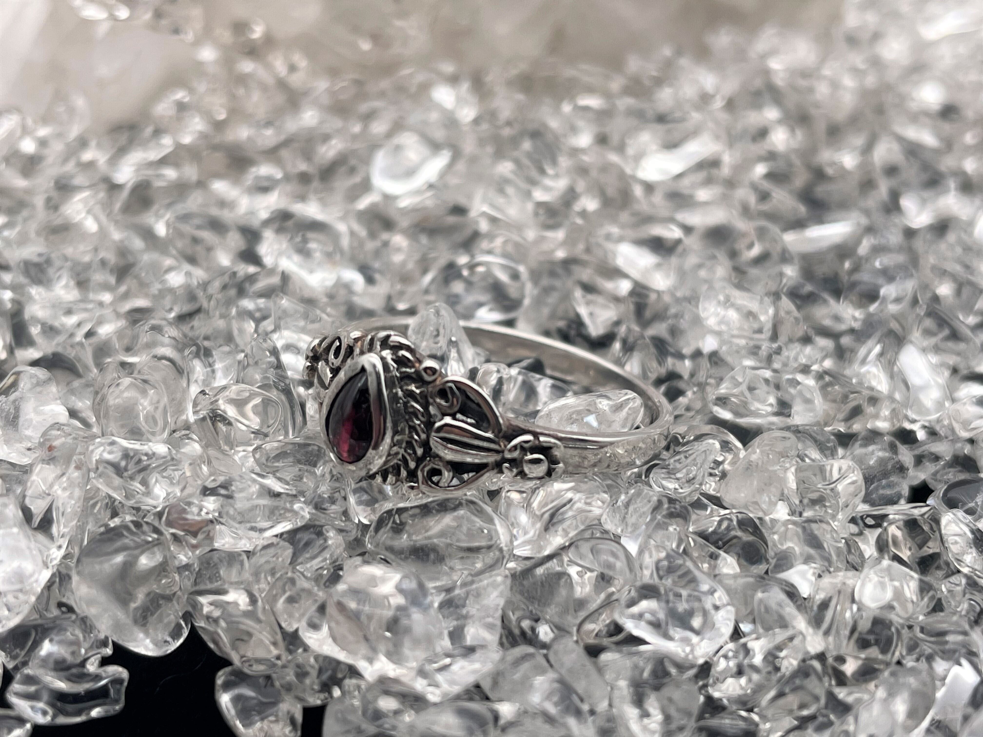 中央にガーネットをワンポイントにしたシンプルな指輪に仕上げています。