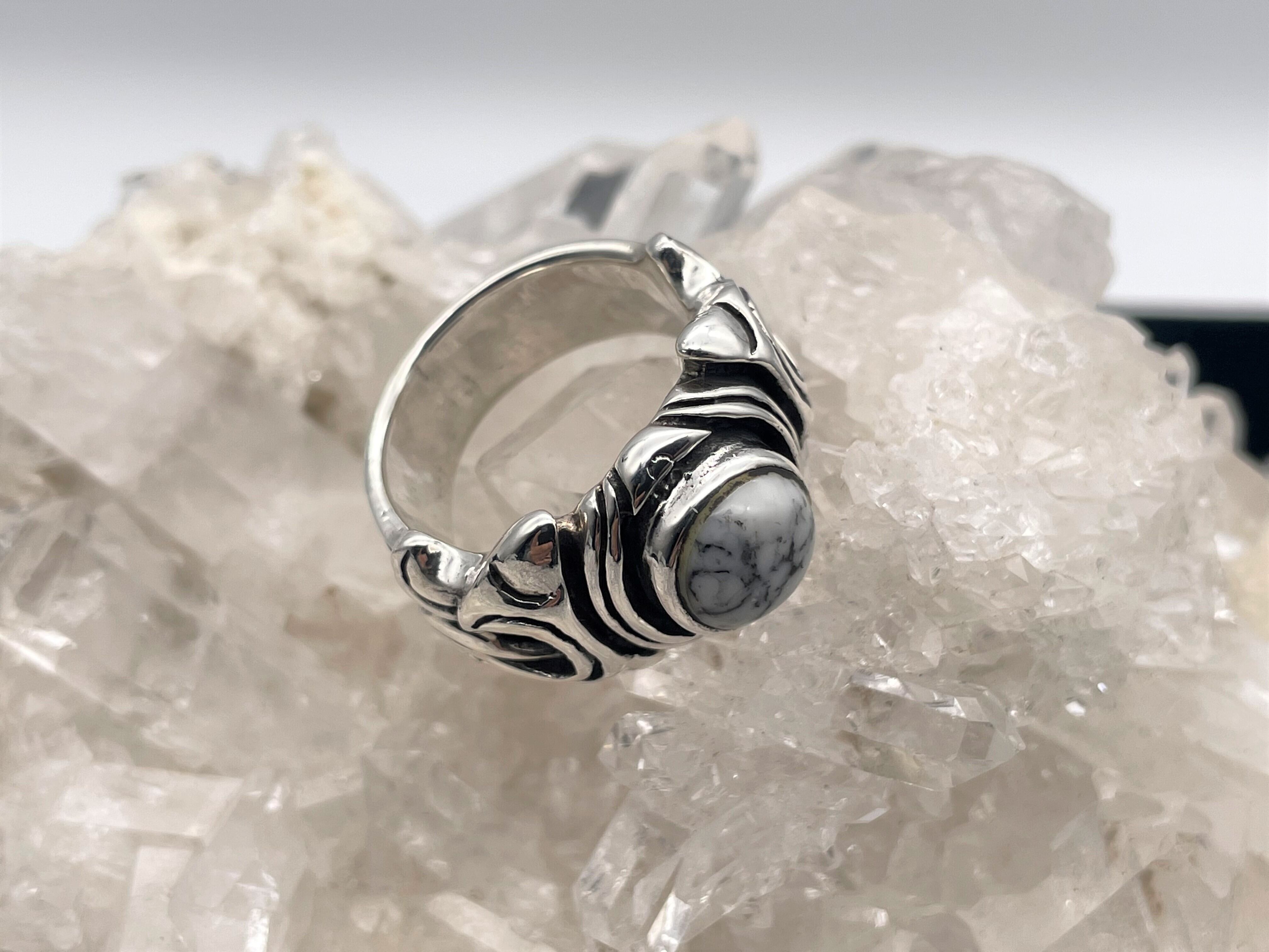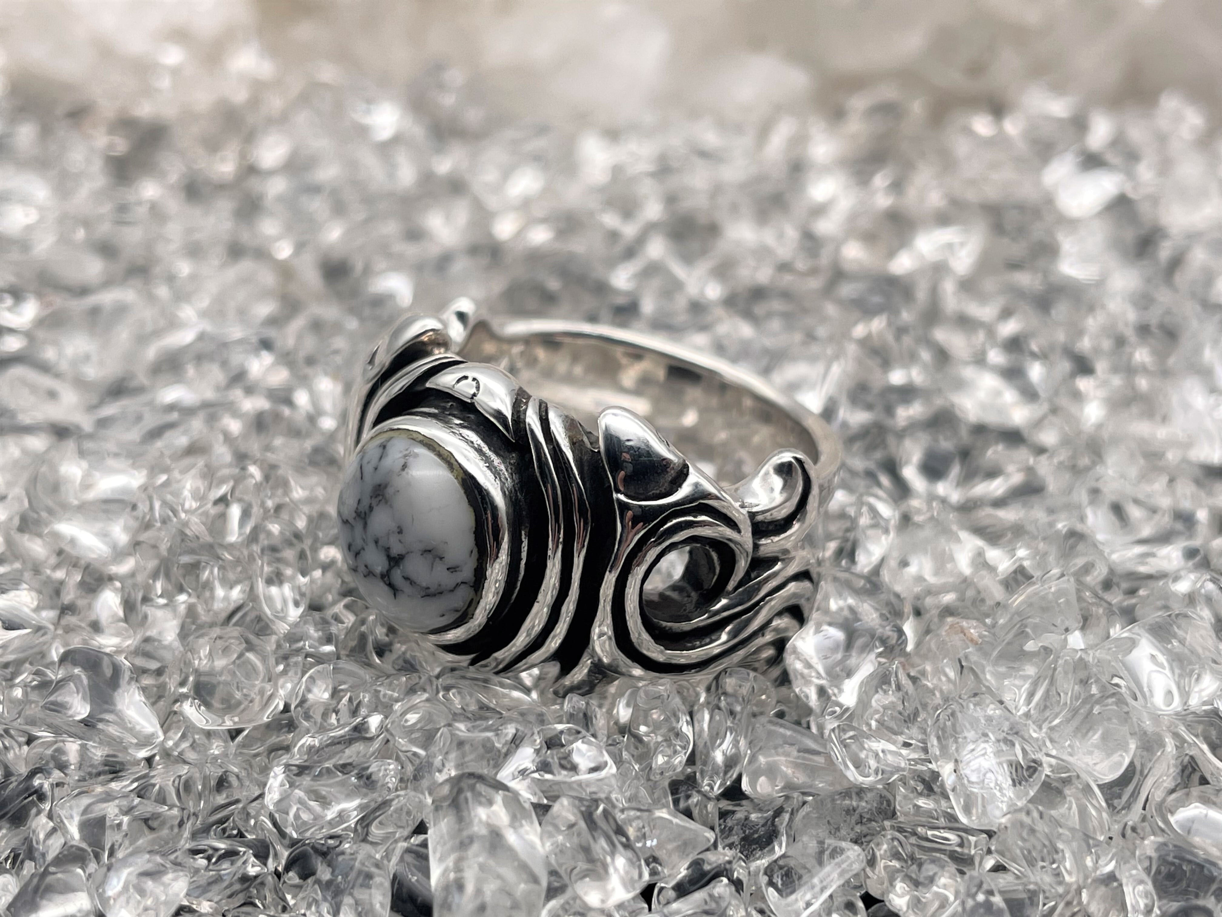 ホワイトターコイズが埋め込まれた925シルバーリングになります。