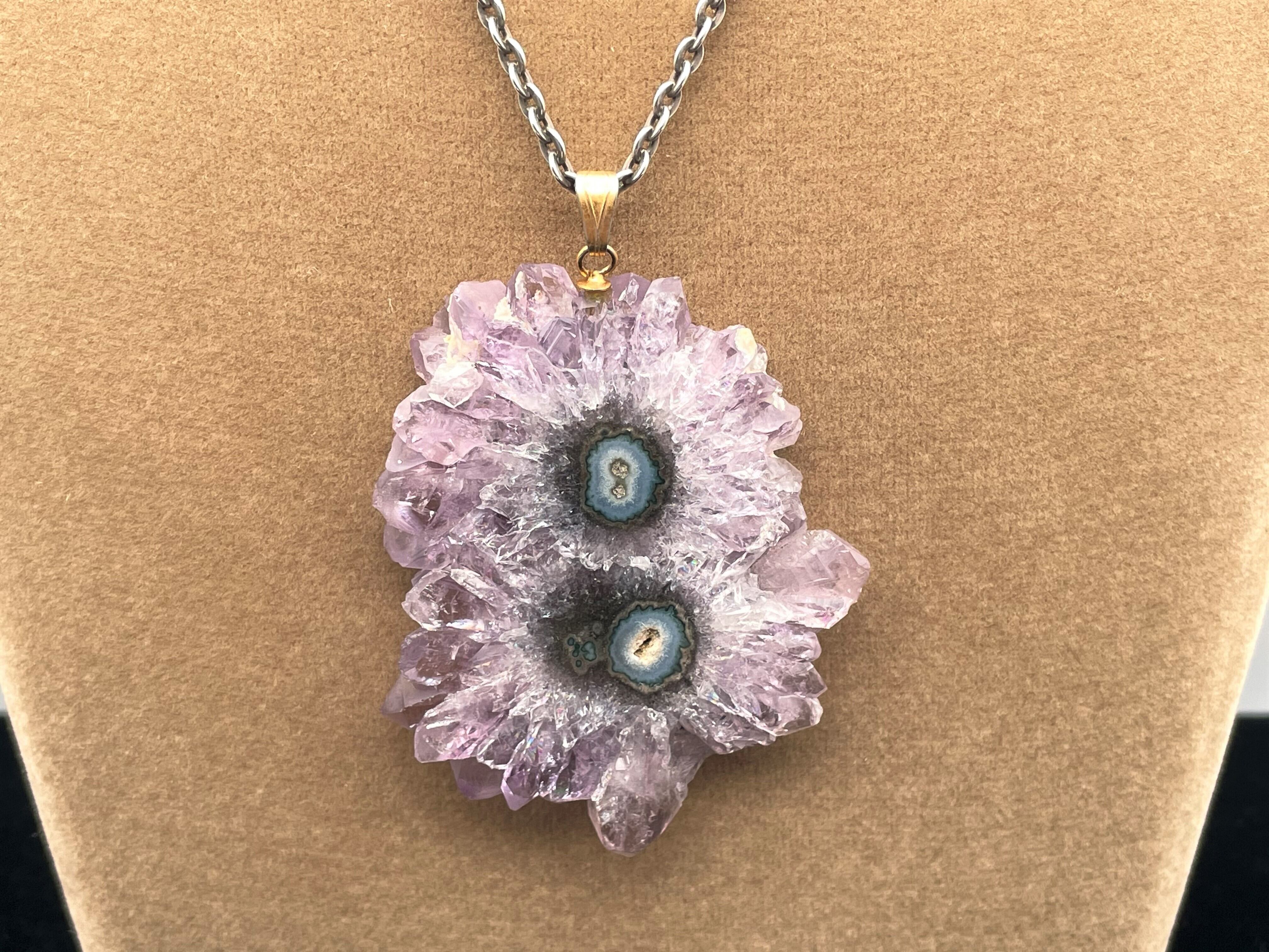 結晶が放射線状に折り重なるように成長したアメジストを加工したペンダントトップになります。