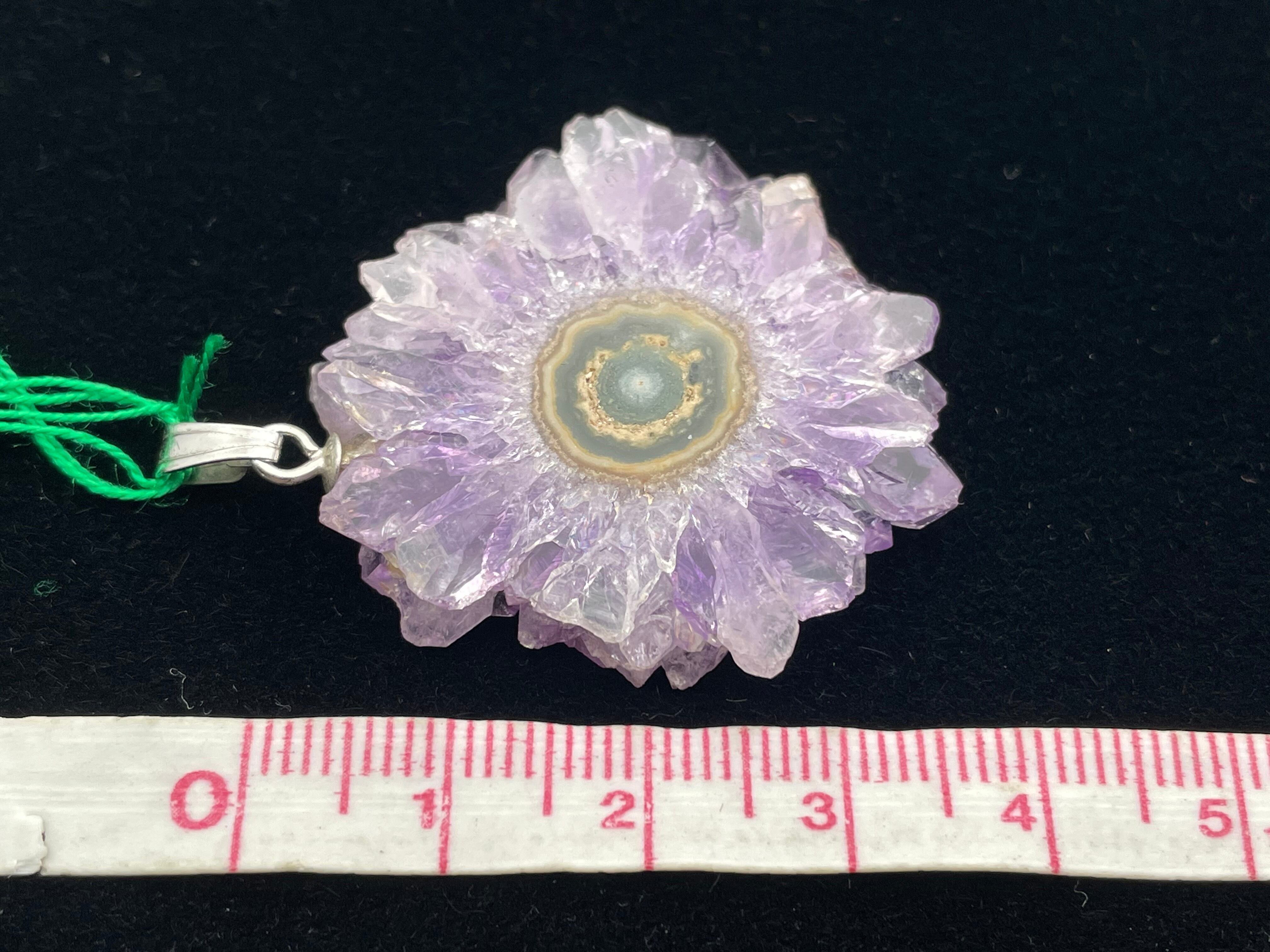 結晶が放射線状に折り重なるように成長したアメジストを加工したペンダントトップになります。