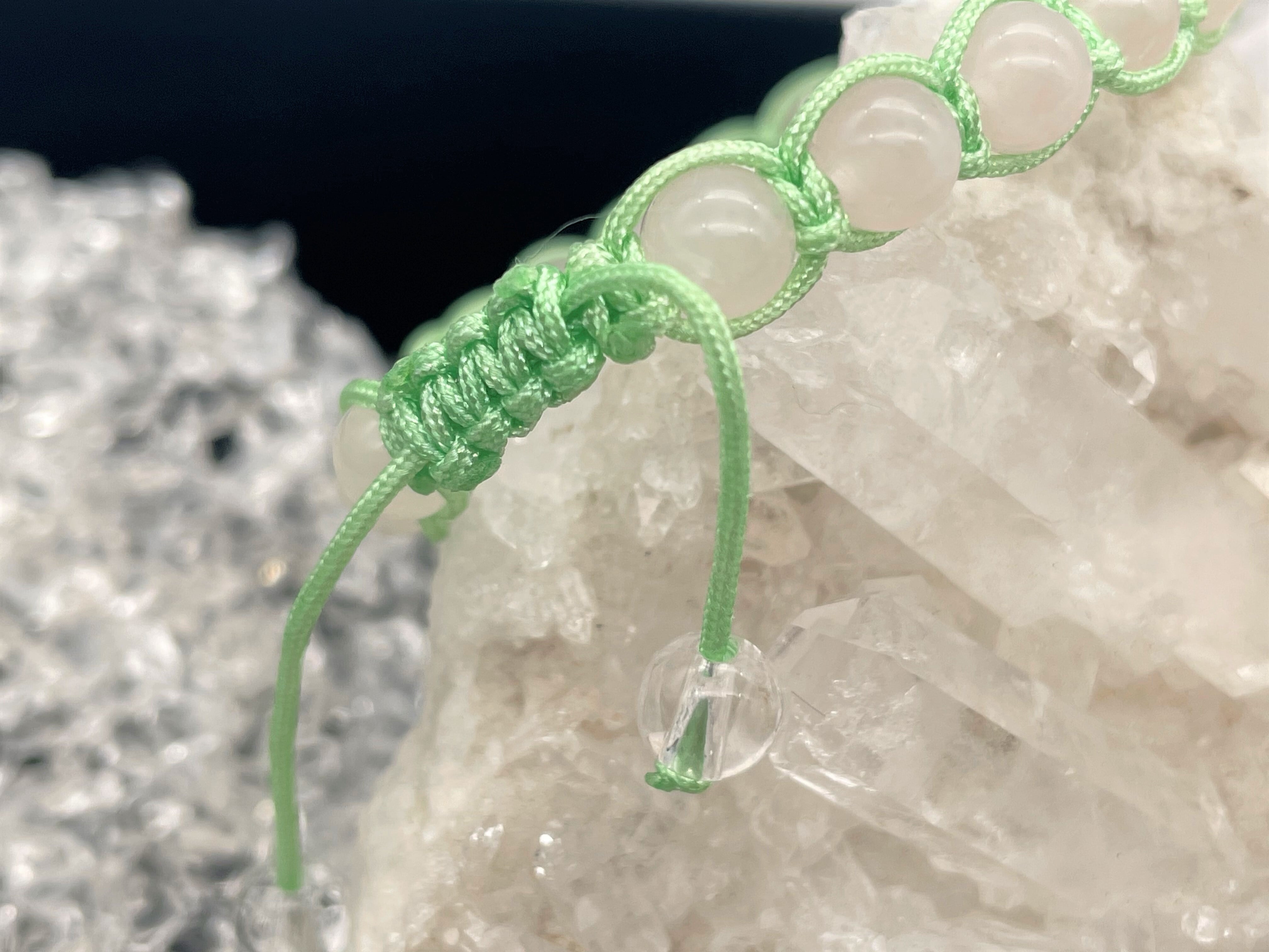 6mmの小さめのローズクォーツをメインに水晶をワンポイントに作られた編みブレスレットになります。