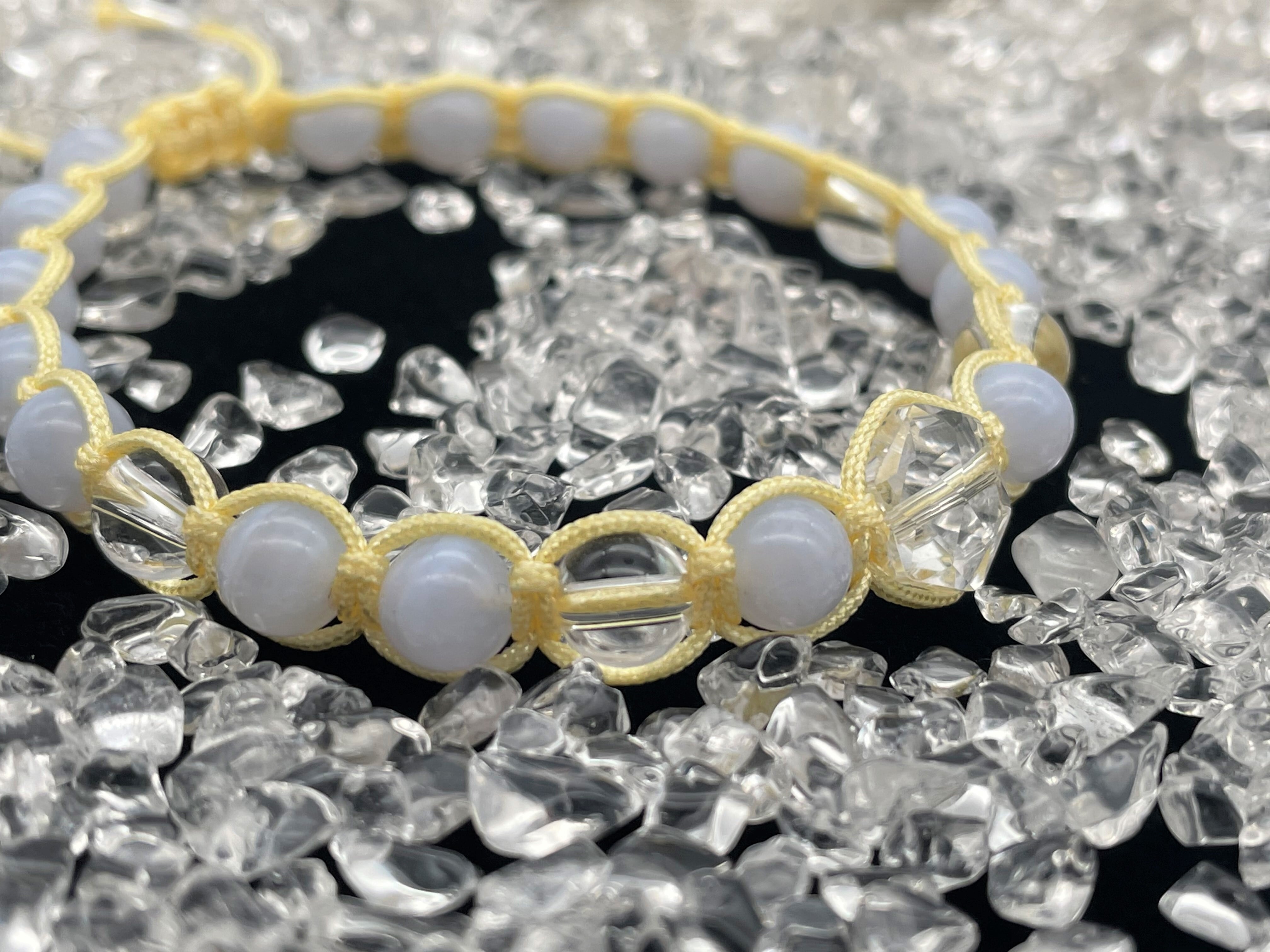 6mmの小さめのブルーレースアゲートをメインに水晶をワンポイントに作られた編みブレスレットになります。