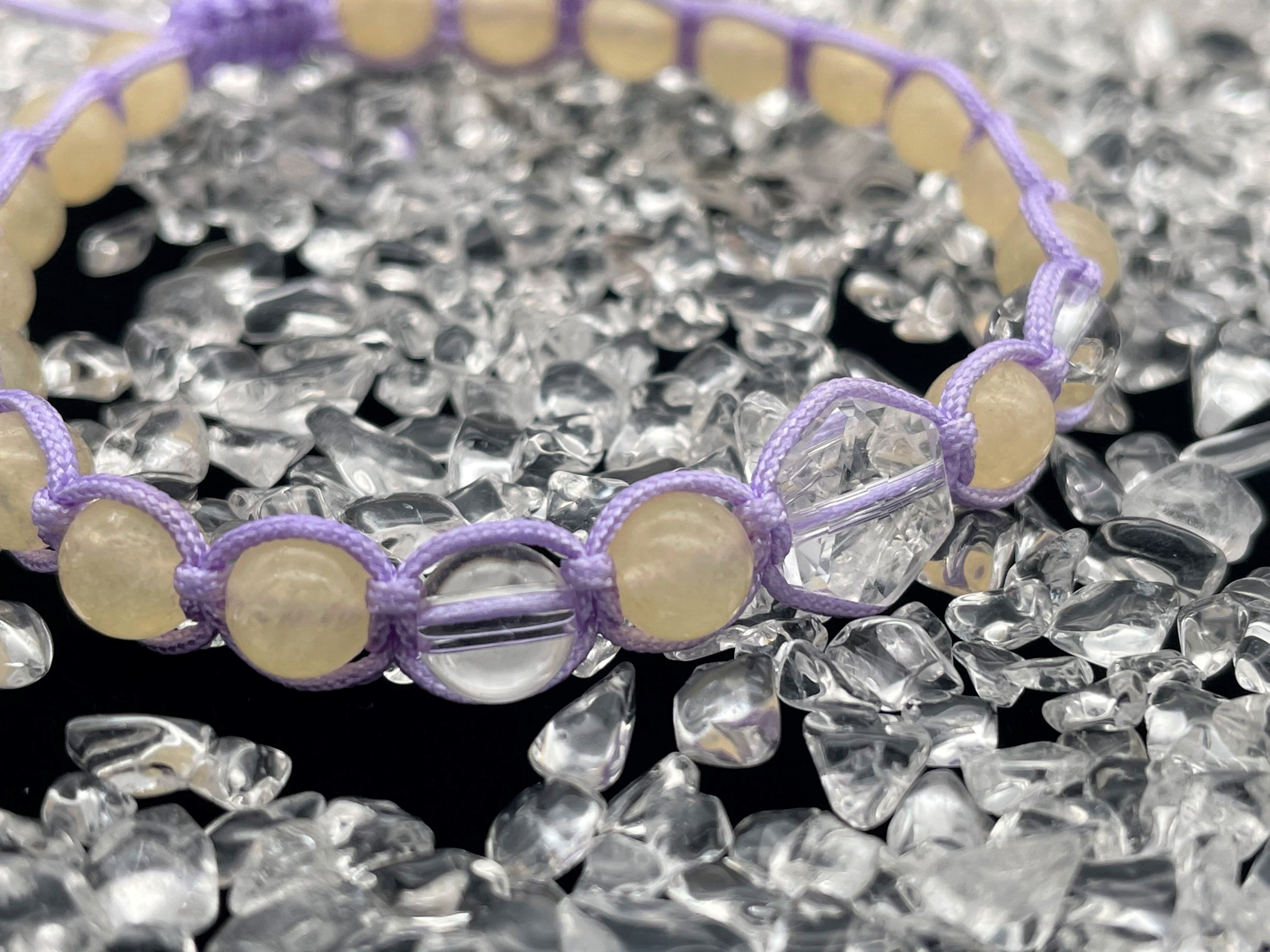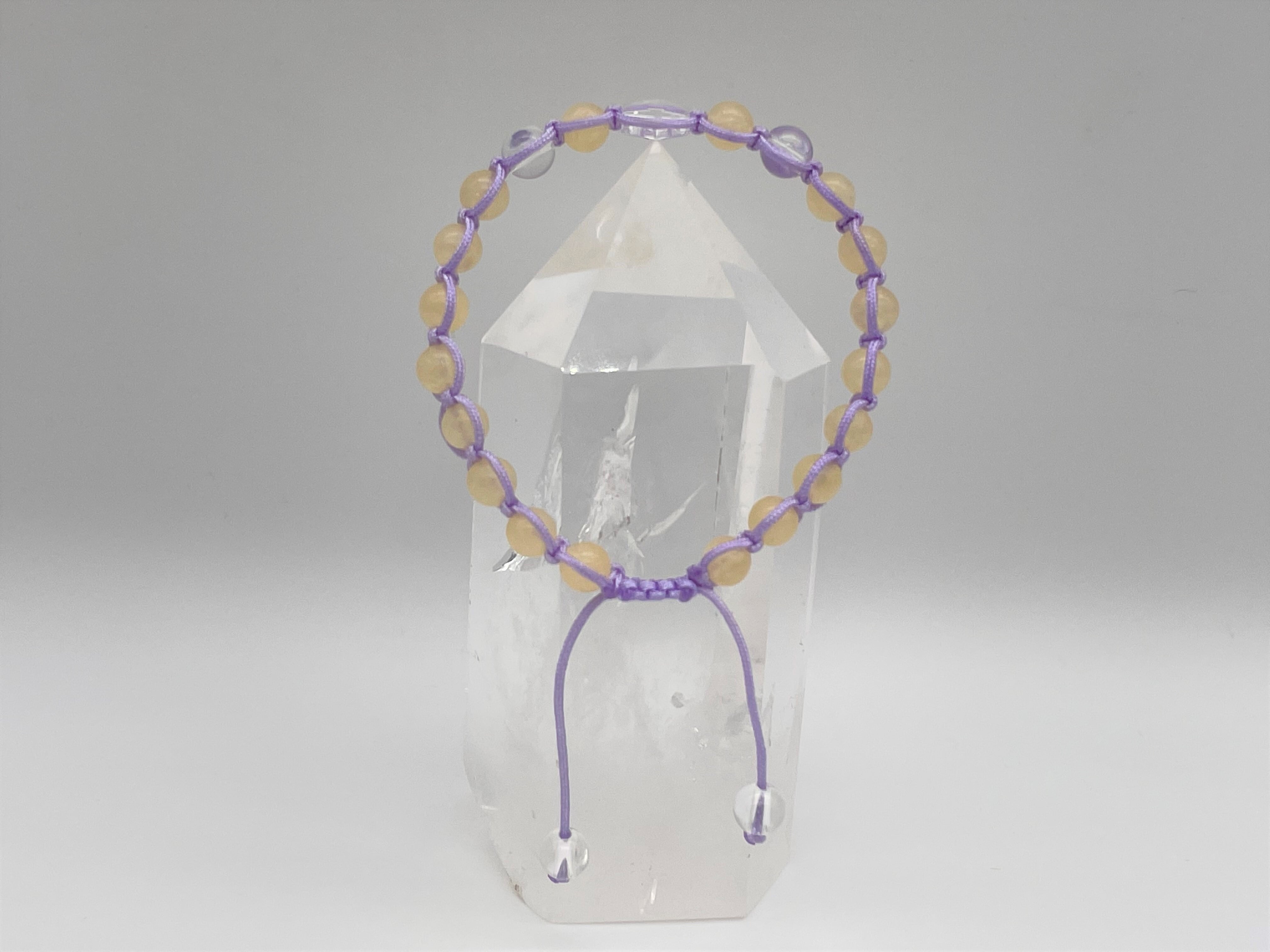 6mmのイエロージェイドをメインにし、ワンポイントに水晶を使用した編みブレスレットになります。