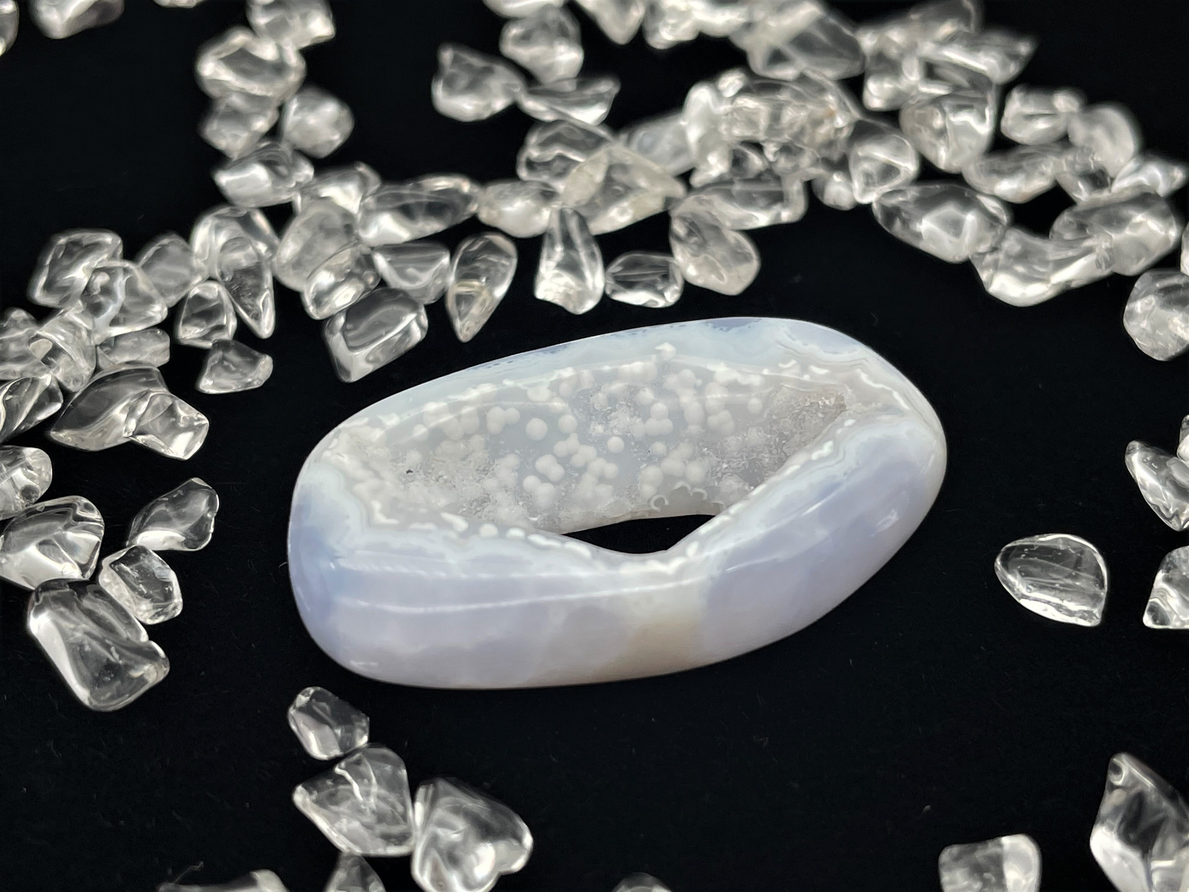 ブルーレースアゲートは深く優しいエネルギーを持つ石とされ、自然な表現力をもたらし、精神や肉体を癒し、人間関係を良好な状態を保つ役割をしてくれると云われております。