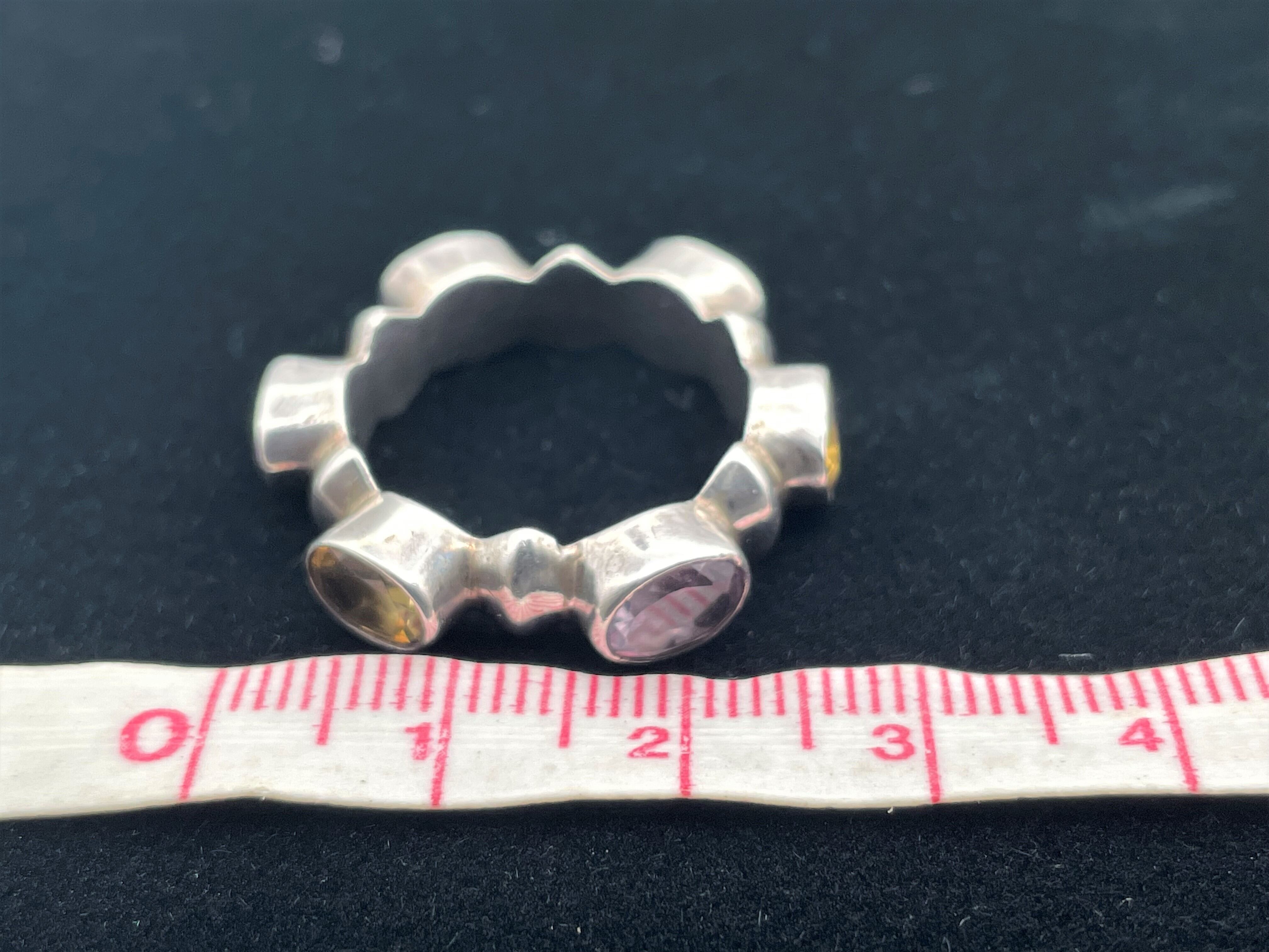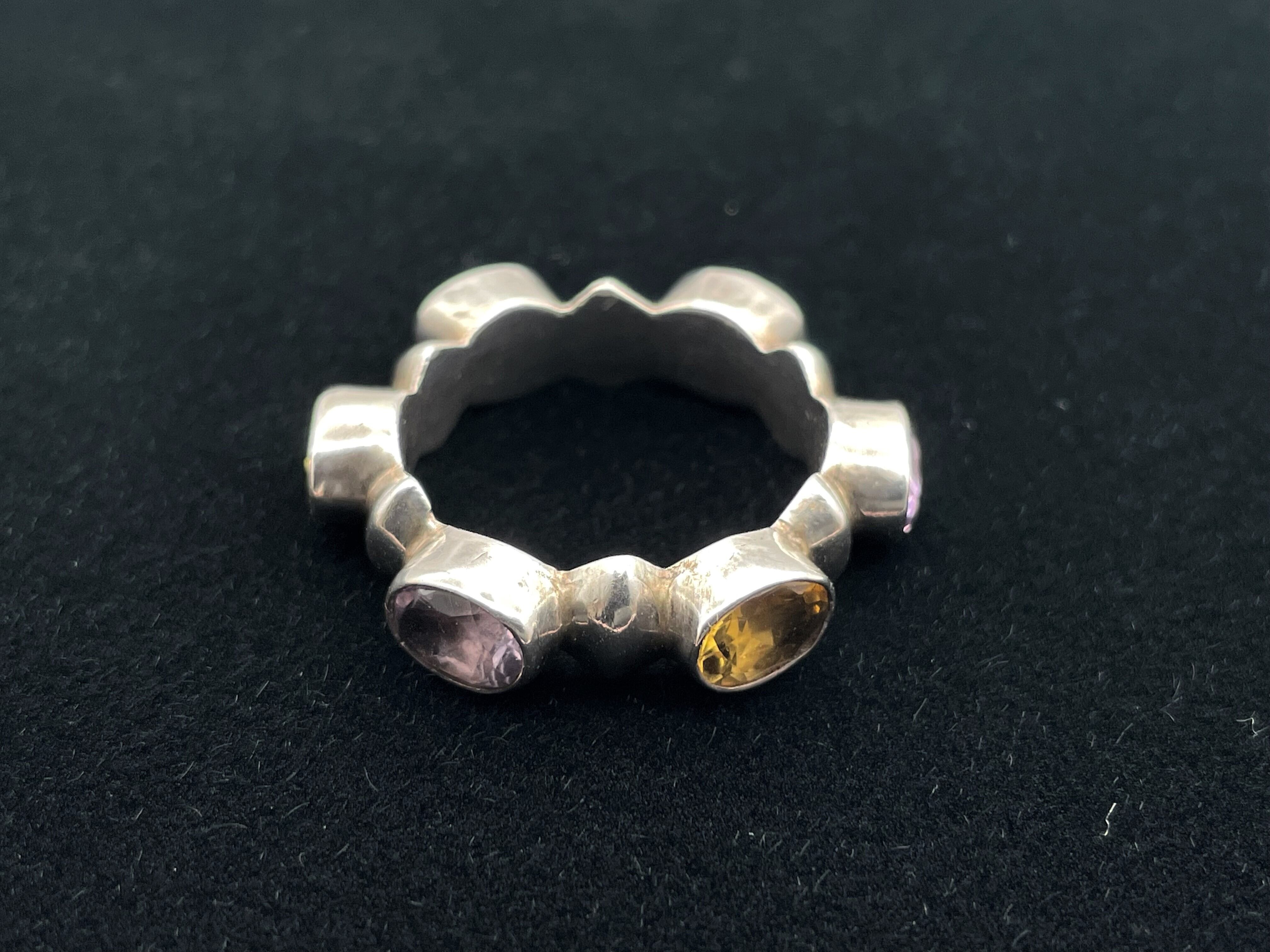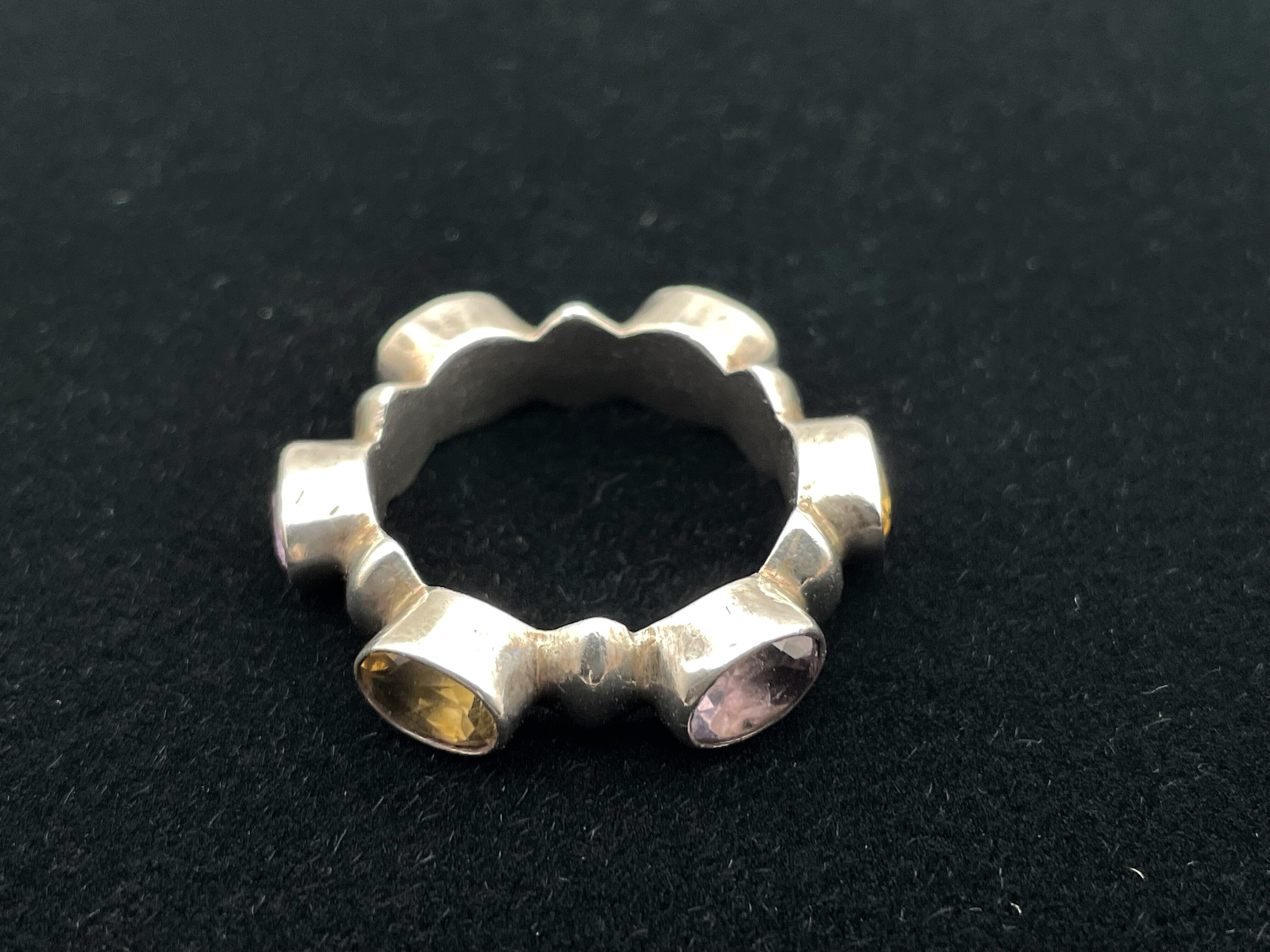 アメジストとシトリンが交互にデザインされた925シルバーリングになります。