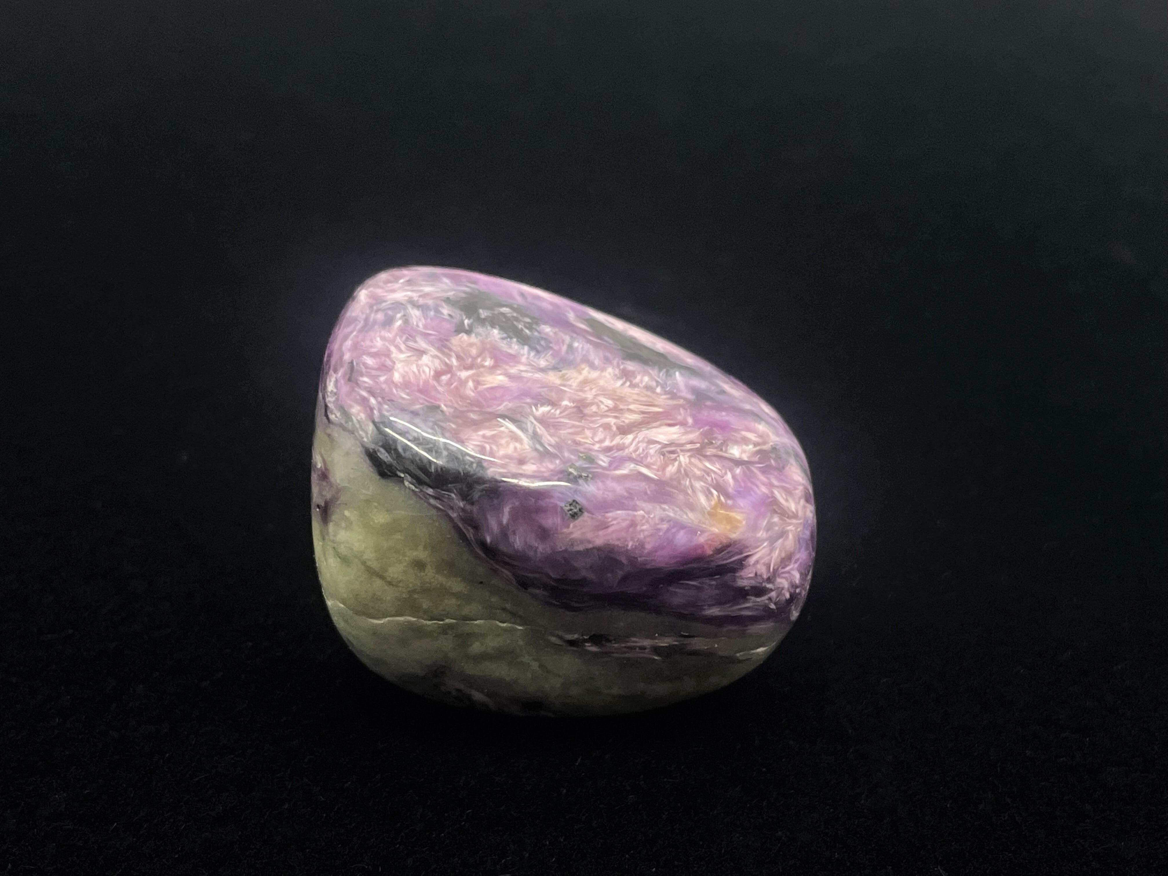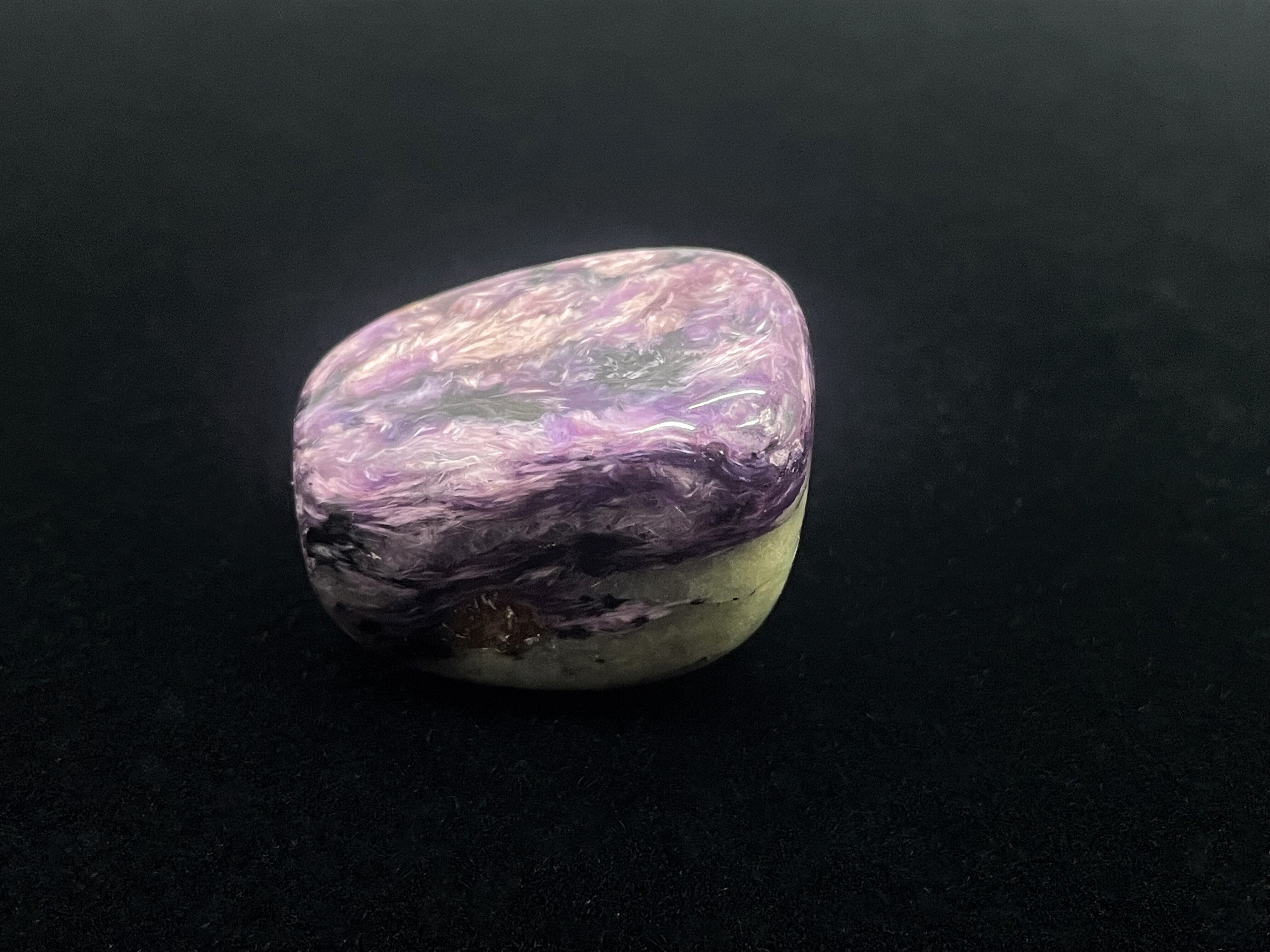 チャロアイトは世界三大ヒーリングストーンの1つに数えられる石であり、癒しの力と浄化作用が非常に強い石とされ、恐怖や不安の克服や脅迫概念を祓い、持ち主の人徳を高め、周囲からの信頼を得るように促す力を持つと云われております。